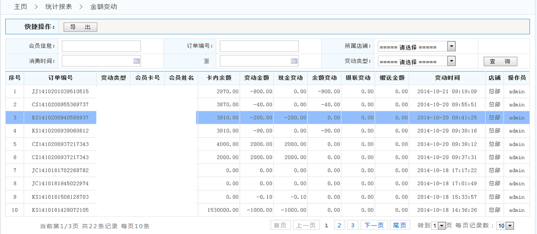 交班管理統(tǒng)計(jì): 1.導(dǎo)出:將按條件查詢到的數(shù)據(jù) 導(dǎo)出成Excel表格 2.查詢:按照條件查詢出數(shù)據(jù)(例如 根據(jù)會(huì)員的店鋪會(huì)員的等級等)