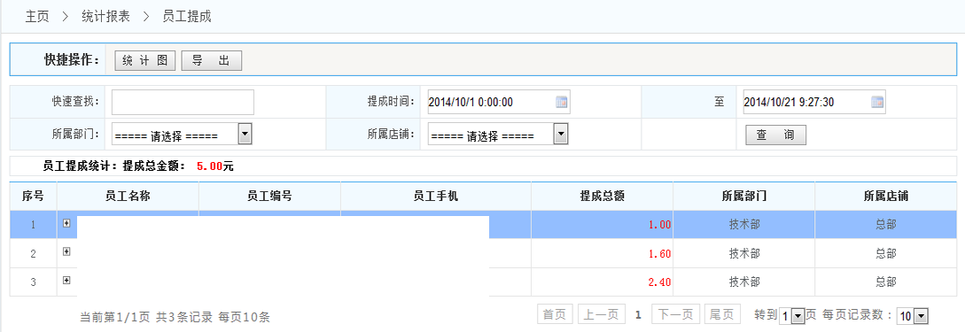 3.員工提成統(tǒng)計:將統(tǒng)計在滿足設(shè)定的條件下的所有員工提成的概況