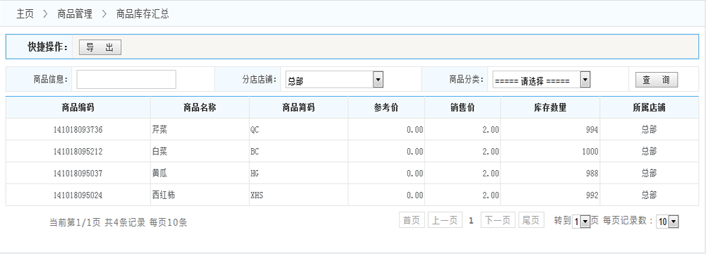 商品庫存匯總: 導(dǎo)出:可以將列表中的數(shù)據(jù)導(dǎo)出到Excel表格 篩選:可以根據(jù)編碼或者簡碼或者名稱 快速找到某個商品 也可以根據(jù)店鋪或者商品分類查詢數(shù)據(jù) 列表:列出所有滿足條件的數(shù)據(jù)(默認(rèn)是顯示所有的數(shù)據(jù))