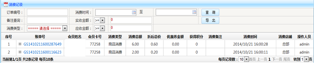 消費(fèi)記錄: 1.查詢:可以根據(jù)消費(fèi)單號 時(shí)間段 消費(fèi)類型等條件查詢 2.導(dǎo)出:可以將按條件查詢出來的數(shù)據(jù),以Excel表格形式導(dǎo)出 3.列表:雙擊訂單號,如果有消費(fèi)詳情的可以查看消費(fèi)詳情