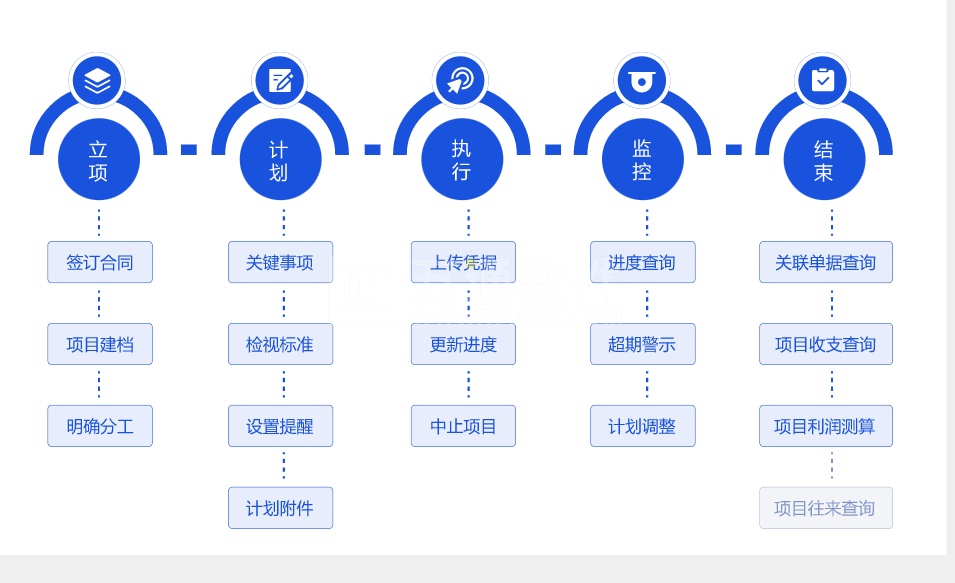 系統(tǒng)中支持查詢:項(xiàng)目進(jìn)度(含關(guān)聯(lián)單據(jù))、項(xiàng)目資金收支情況、項(xiàng)目利潤測算情況、項(xiàng)目損益表(財(cái))。